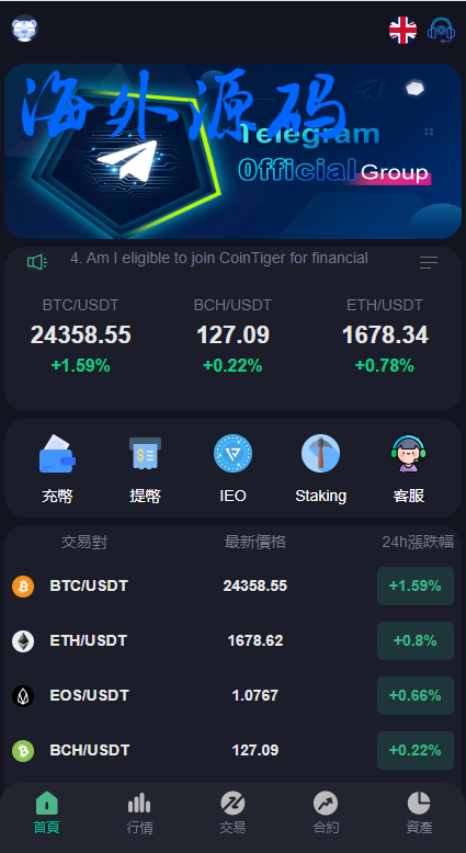 系统多种语言,支持币币秒合约交易、新币申购、质押矿机等功能