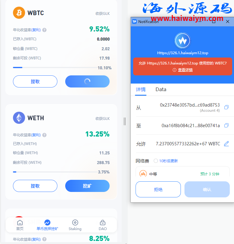 系统是Laravel框架开发的ETH授权质押系统,正常钱包登录,前端中文跟英文