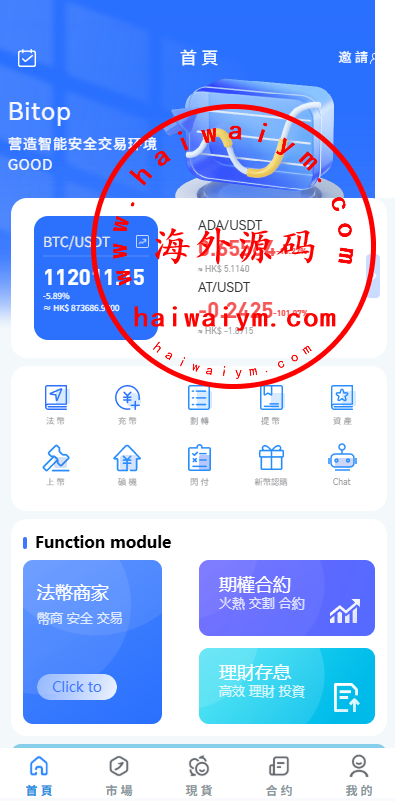 投资理财,新币认购,法币交易,社区聊天,签到等功能