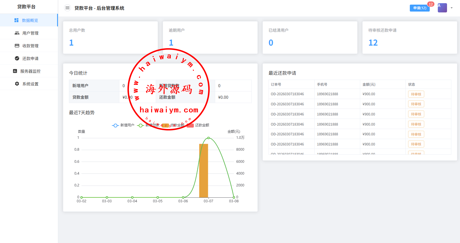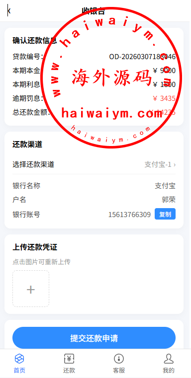 系统前端后台VUE开发,服务端JAVA开发全开源带源码后台可一键填充用户数据生成贷款逾期前端用户手机登陆,就能查看自己的欠款信息