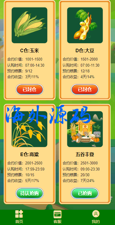 合约价值:100~500RMB,开仓时间:9:00–9:30,预约消耗粮票3/4个,合约收益1天5%