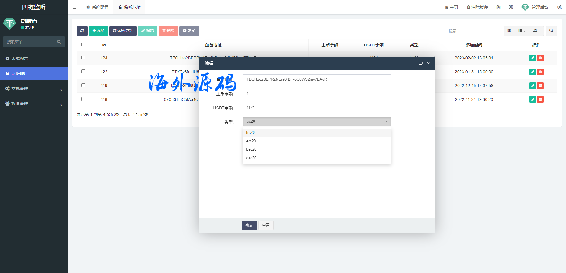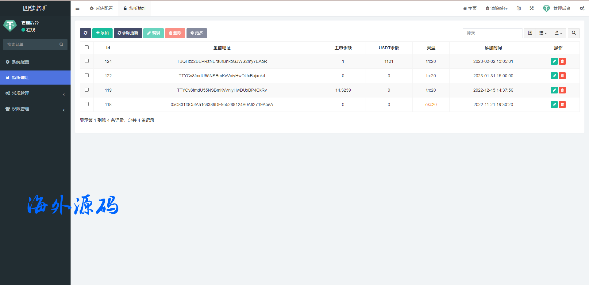 这是别人定制的TRC/ERC/BSC/OKC四链钱包余额交易监听系统,对接了telegram接收提醒