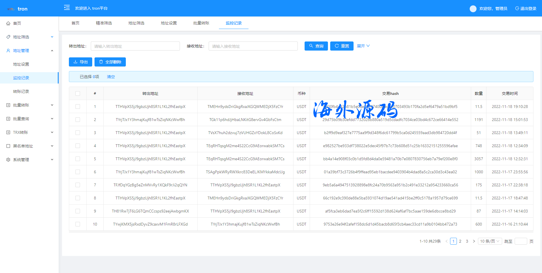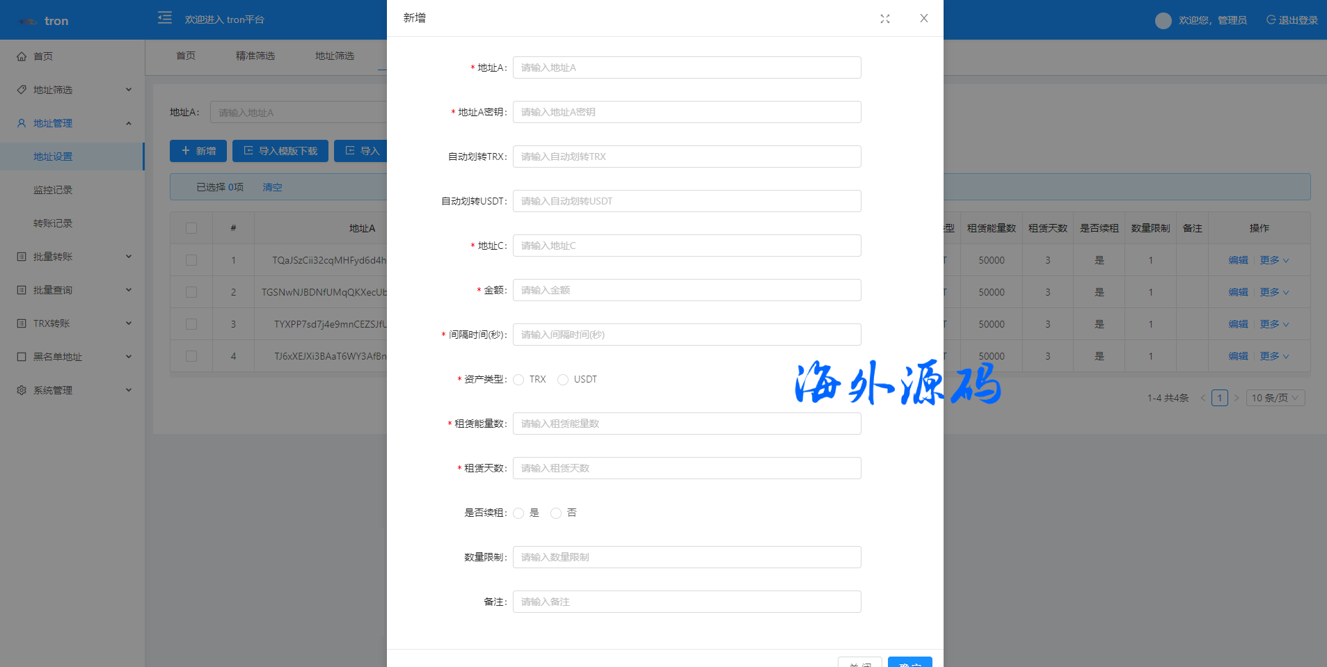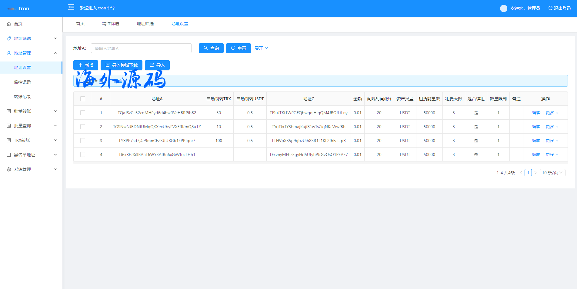 特色功能 trx地址监控 a地址监控c地址 c地址有交易 a地址会像c地址交易的地址进行返现 返现金额可设置 可监控 c地址转账记录