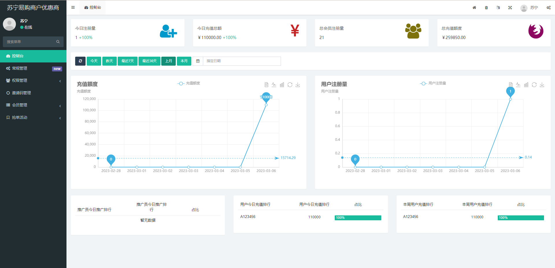 系统模式就是前端注册会员联系客户充值余额,后台添加单独会员的活动