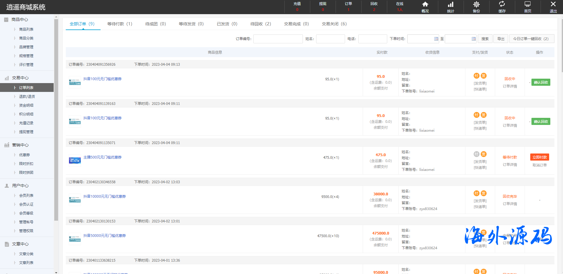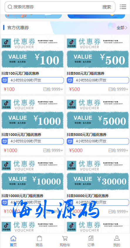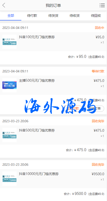 用户前端下单,后台订单可以直接回收,后台支持设置默认邀请码和抢卷时间限制