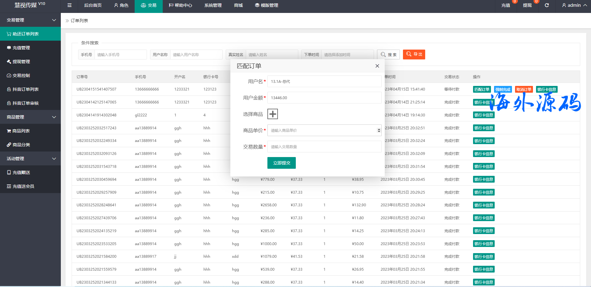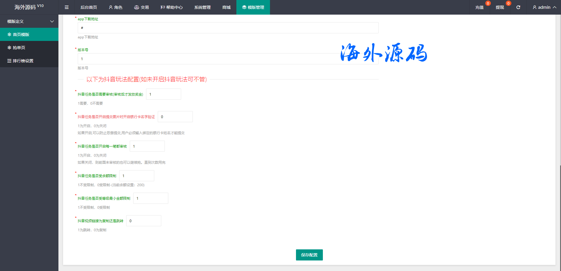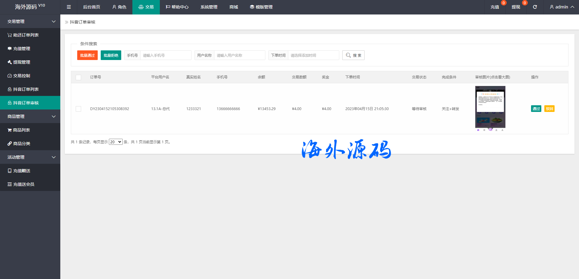 手动刷单后台可设置用户订单金额等,新增了抖音玩法前端提交后台审核,系统新增多个功能