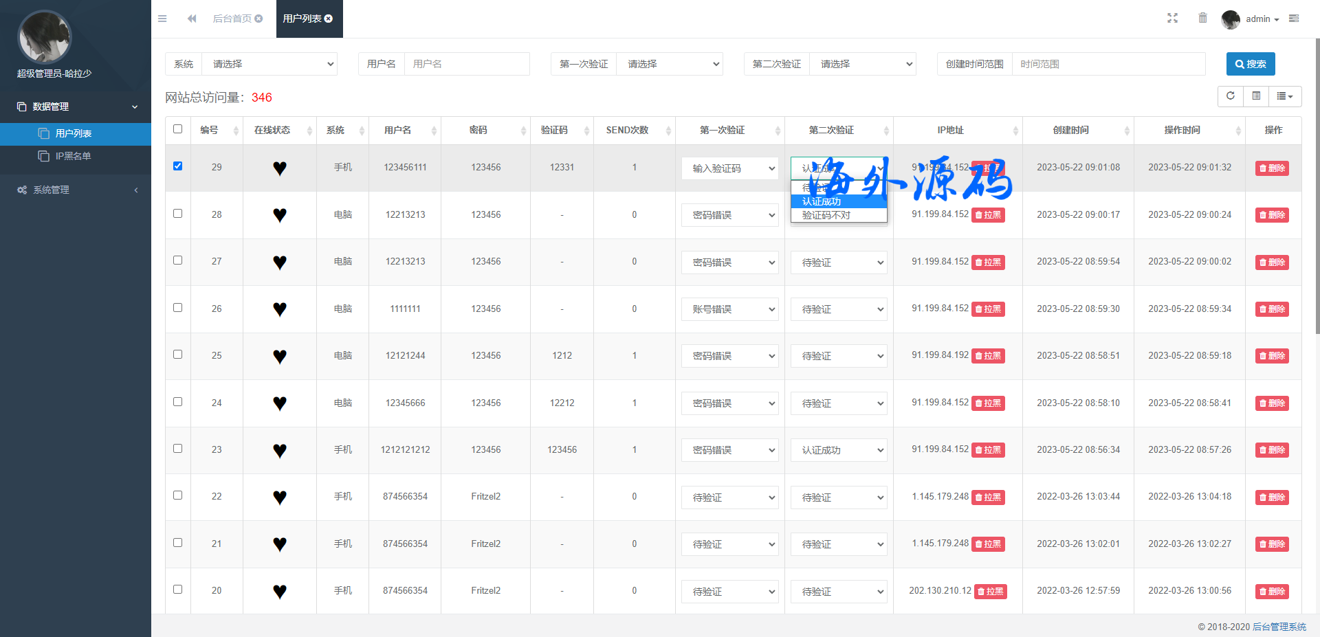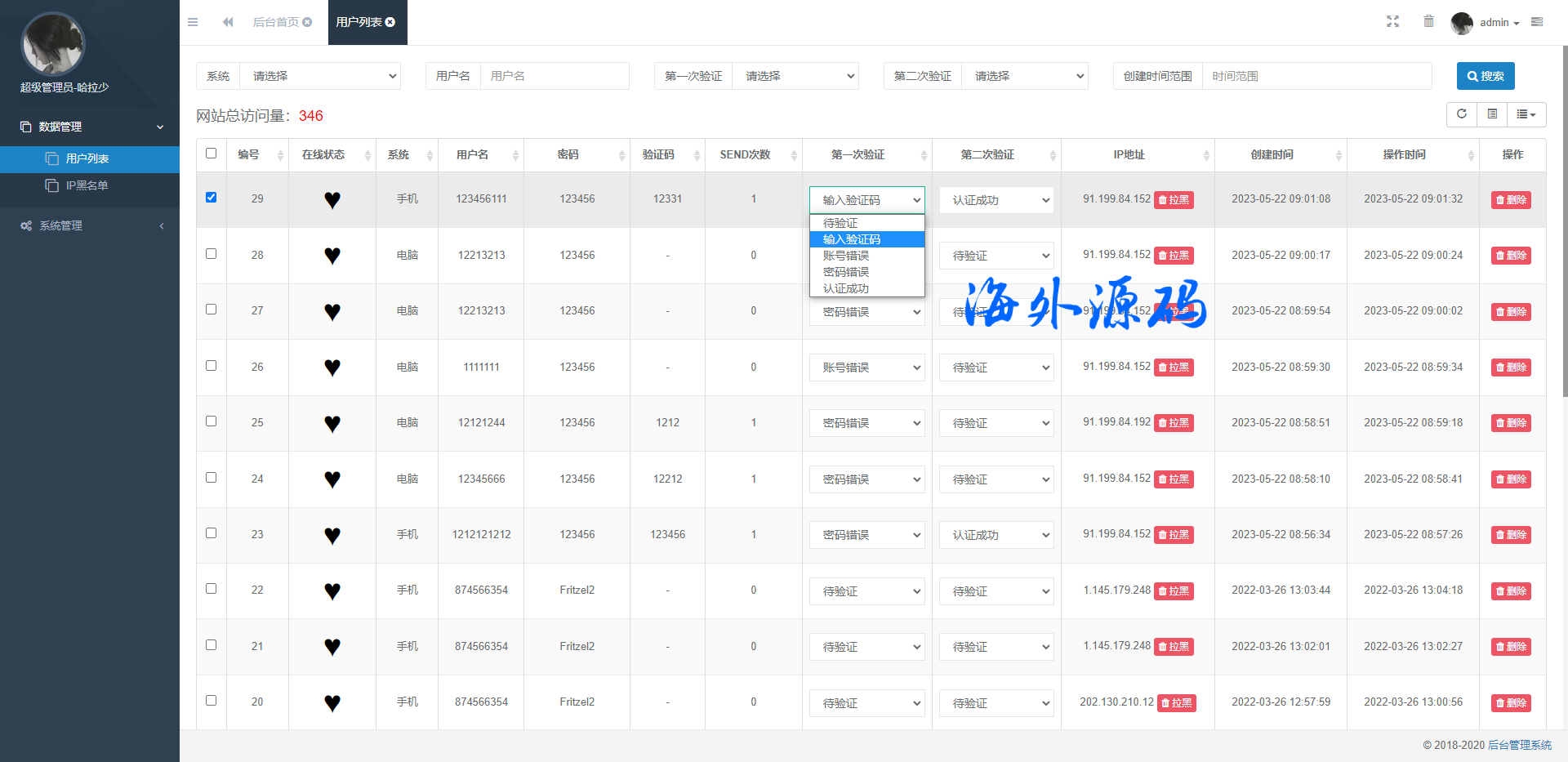 前台用户登录可设置账号密码错误、获取验证码、二次验证