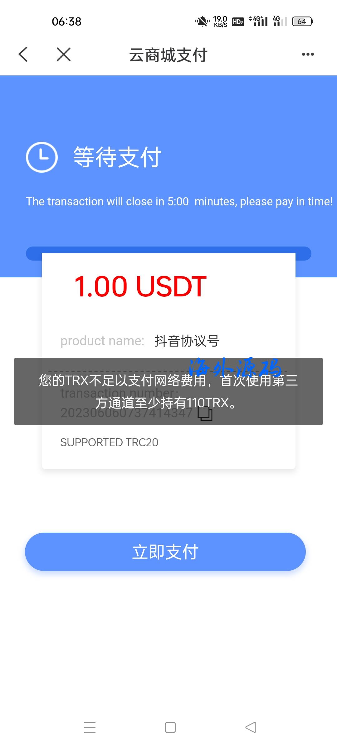 新增前端弹窗公告,支付提示usdt余额不足,支付提示首次支付trx不足100