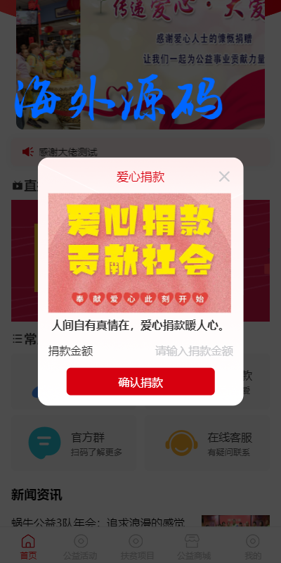 系统功能有爱心捐赠、产品投资、商城、签到、三级分销等功能