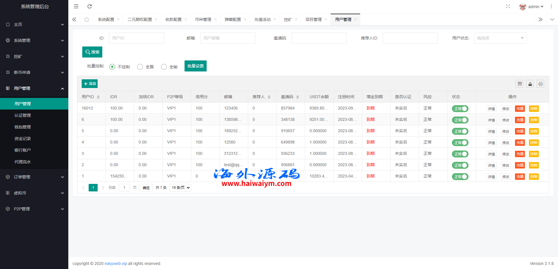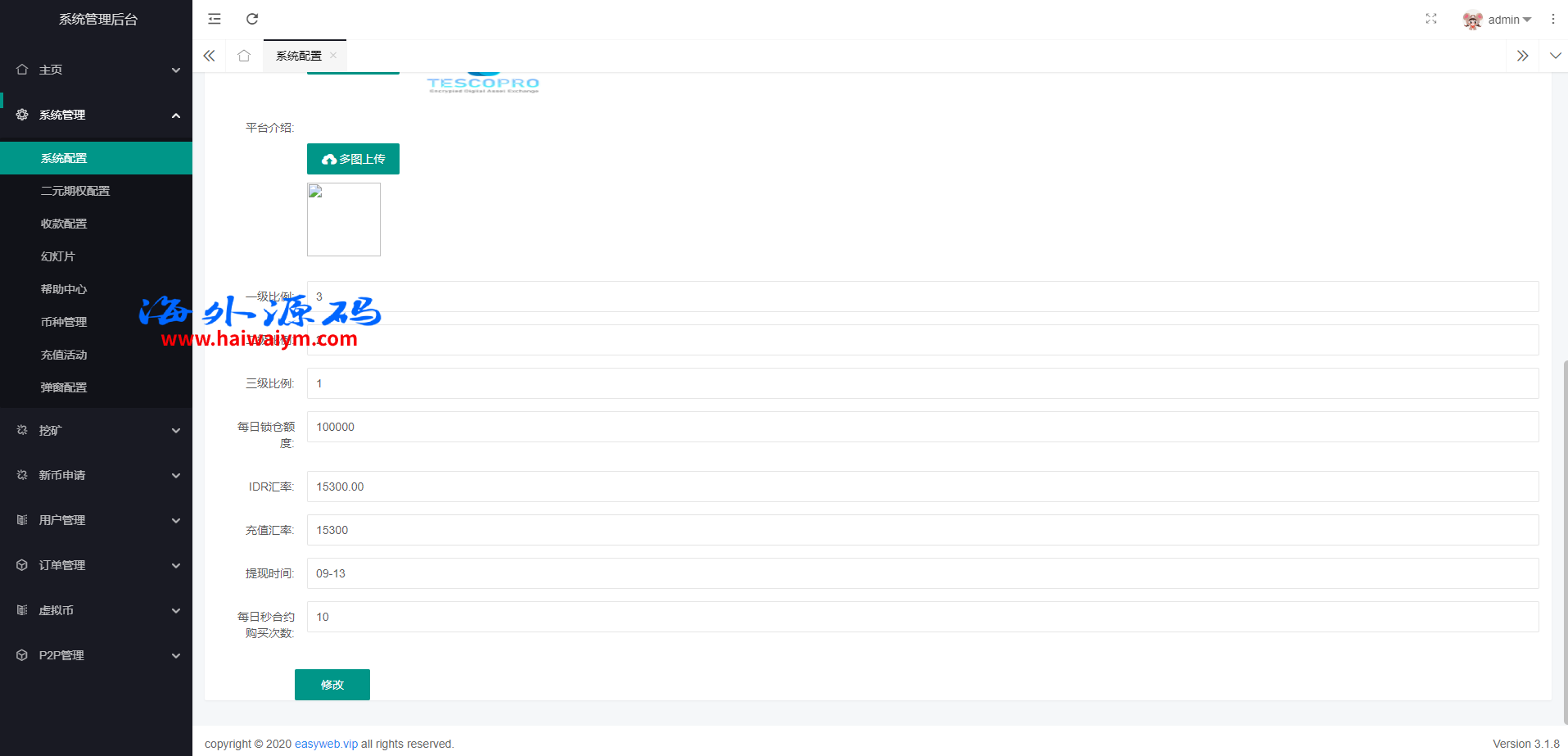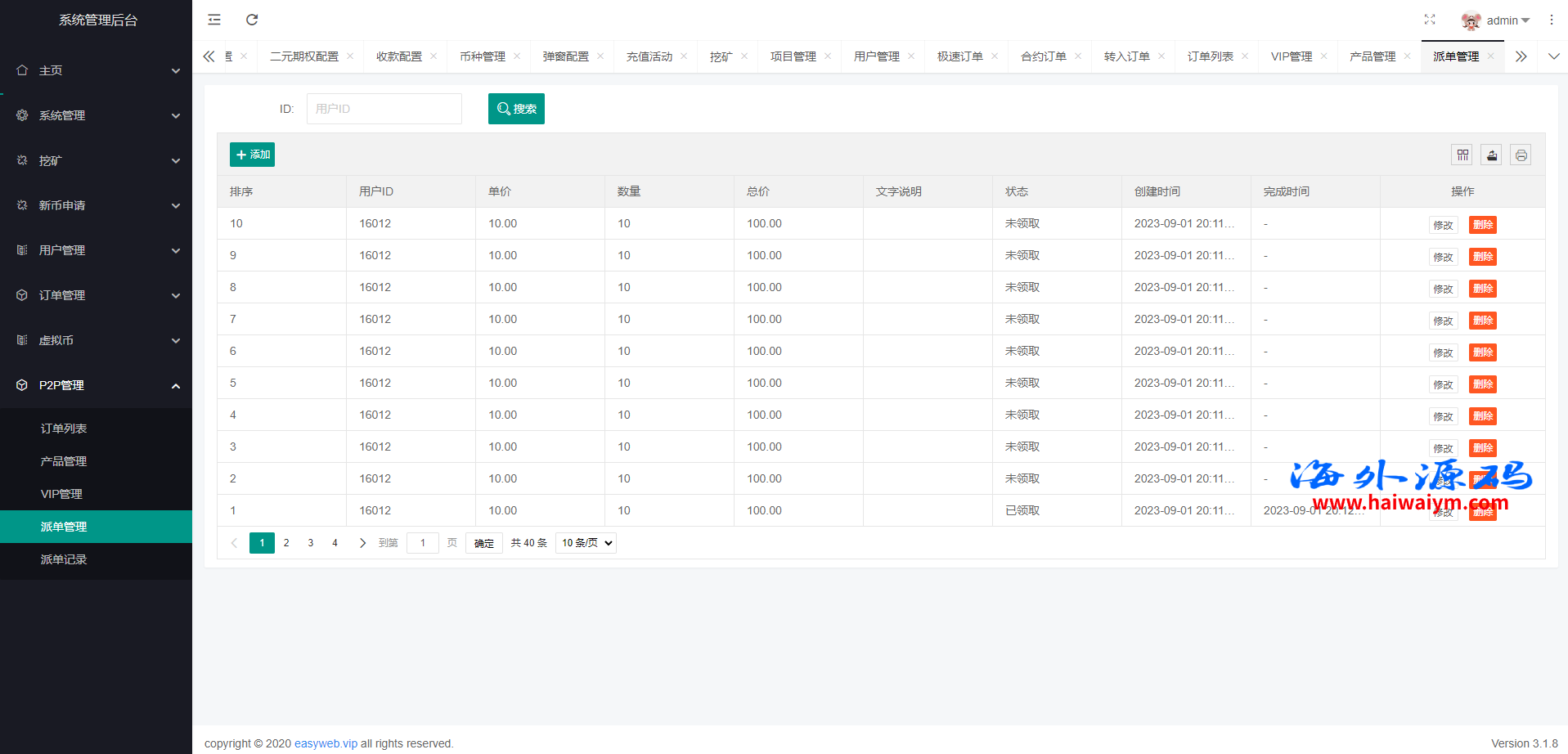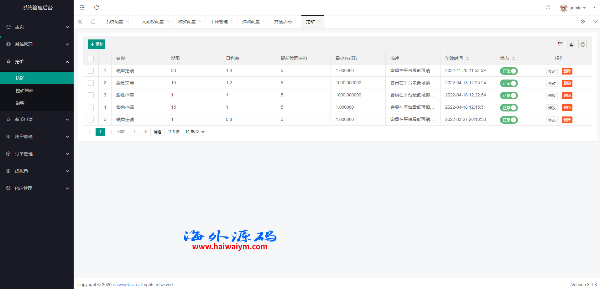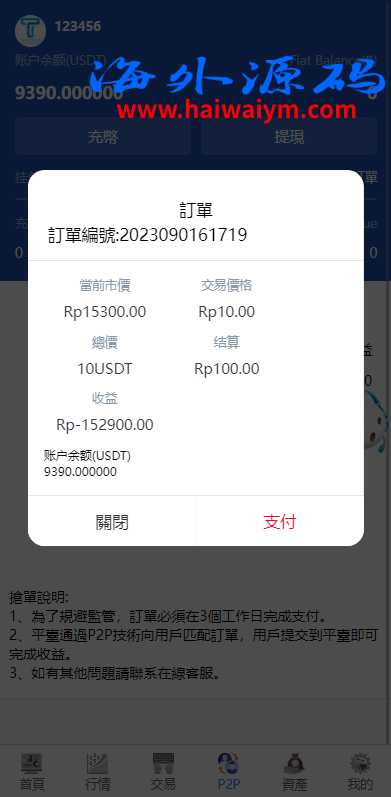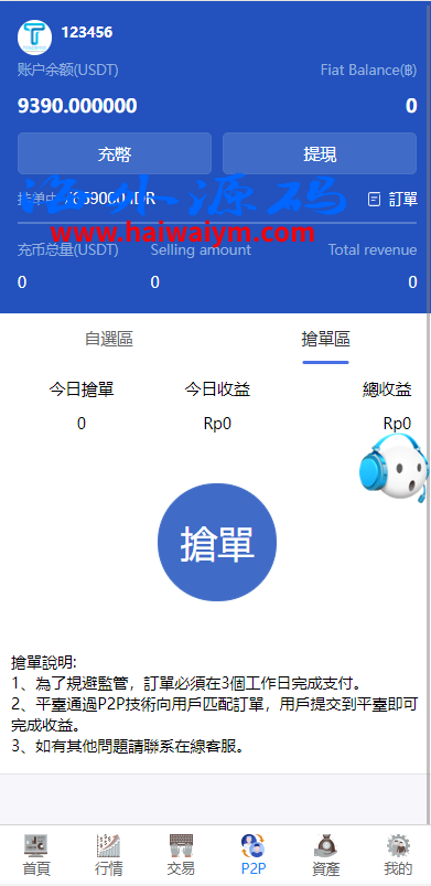 系统新增p2p理财功能、派单抢单功能,支持锁仓质押、三级分销、下单限制等功能