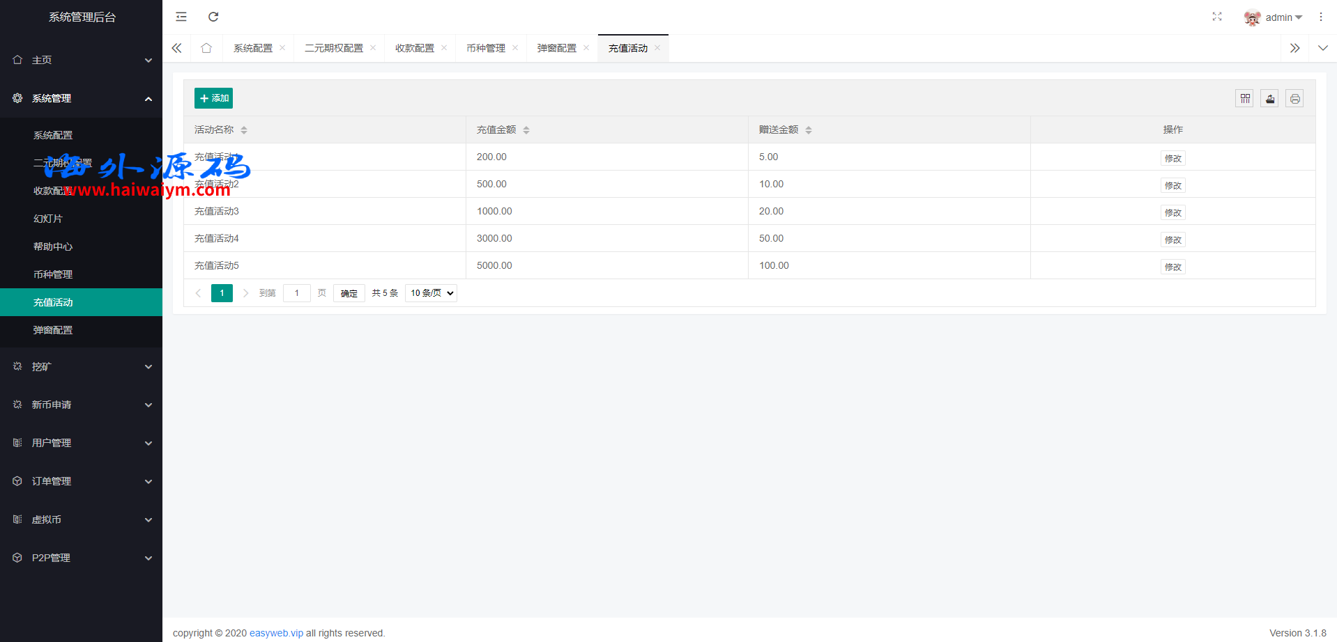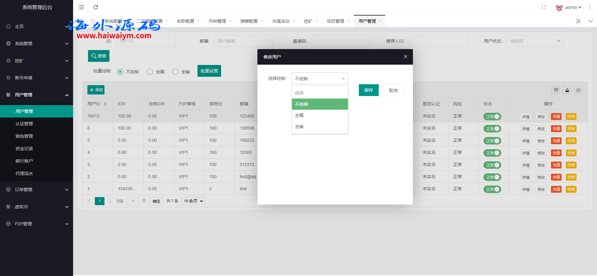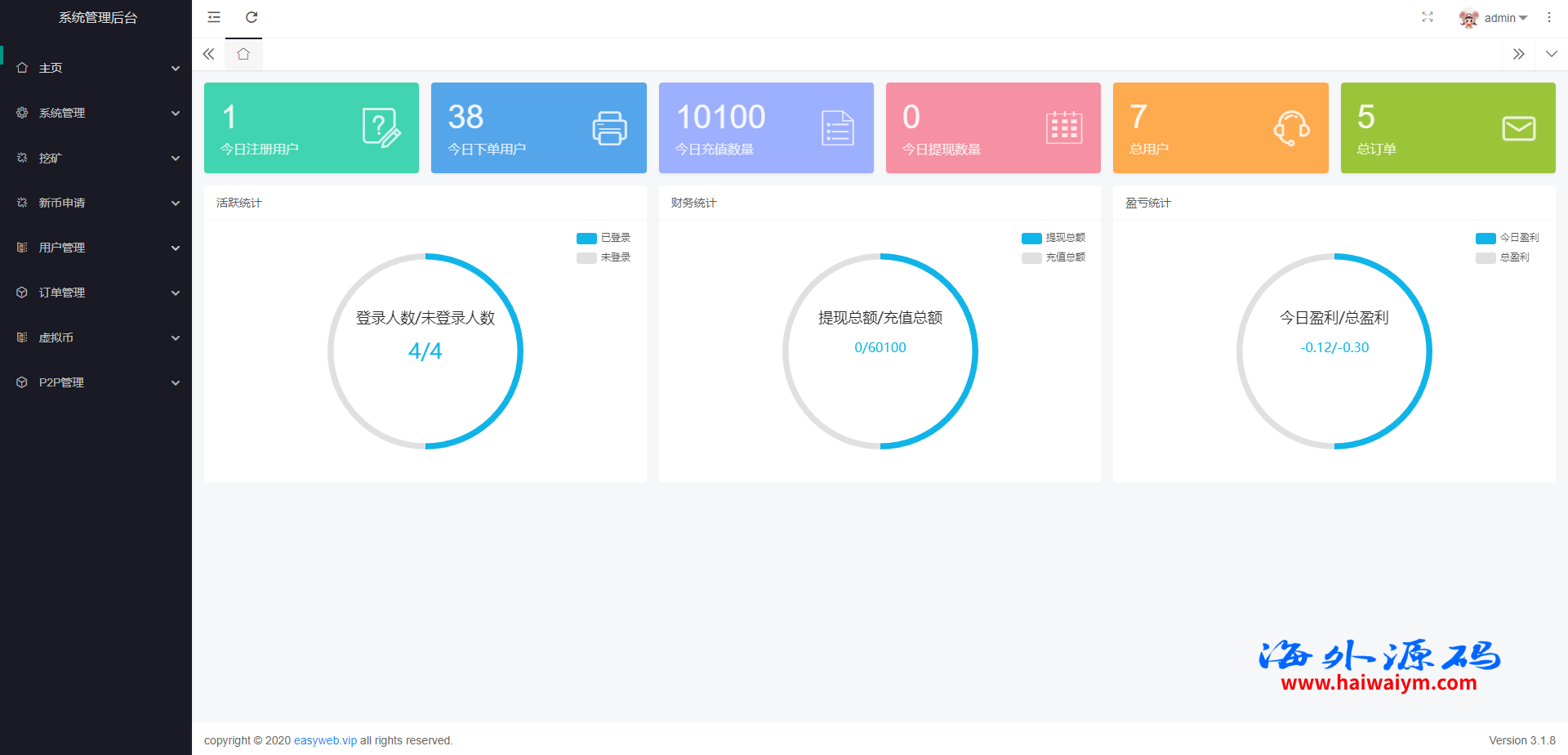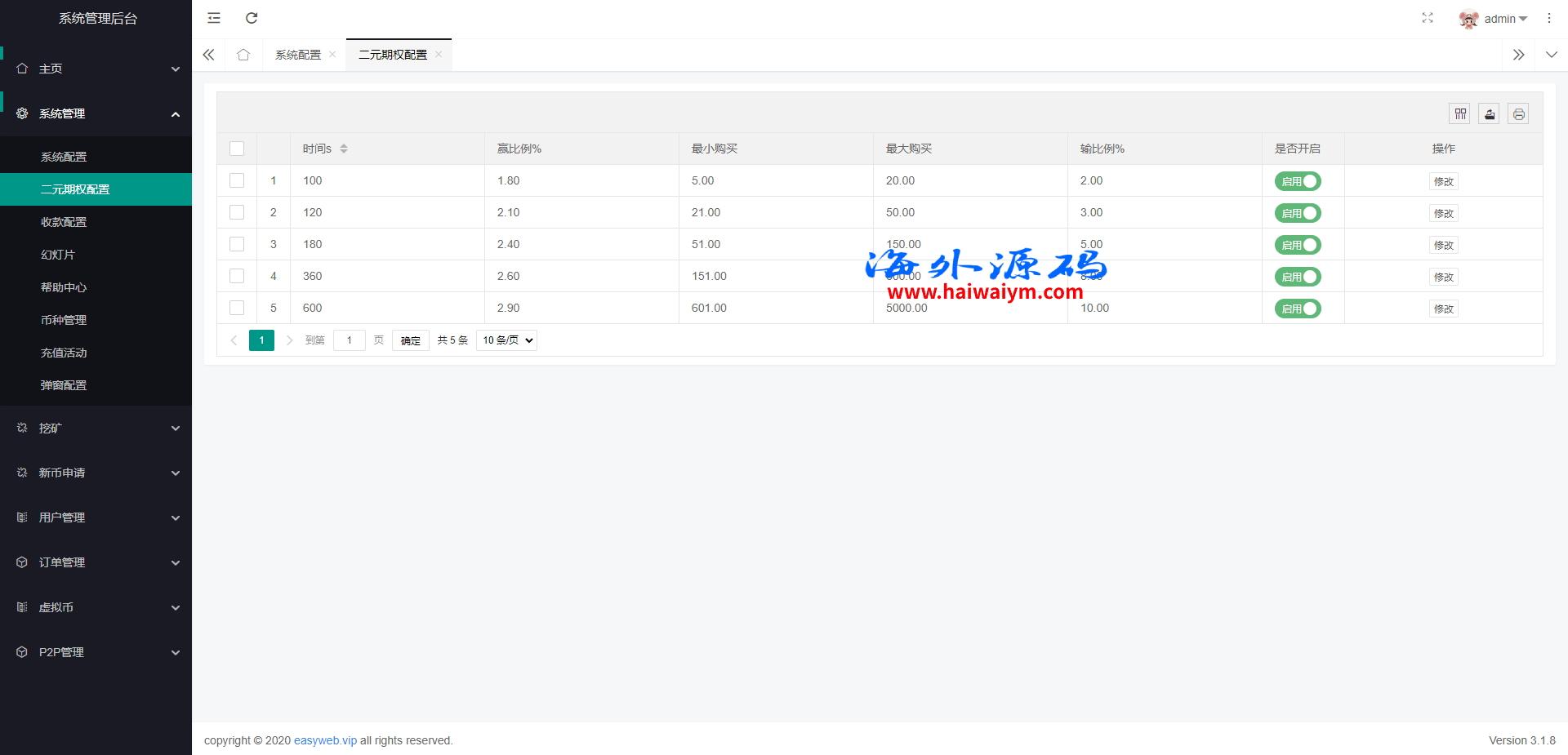 系统新增p2p理财功能、派单抢单功能,支持锁仓质押、三级分销、下单限制等功能