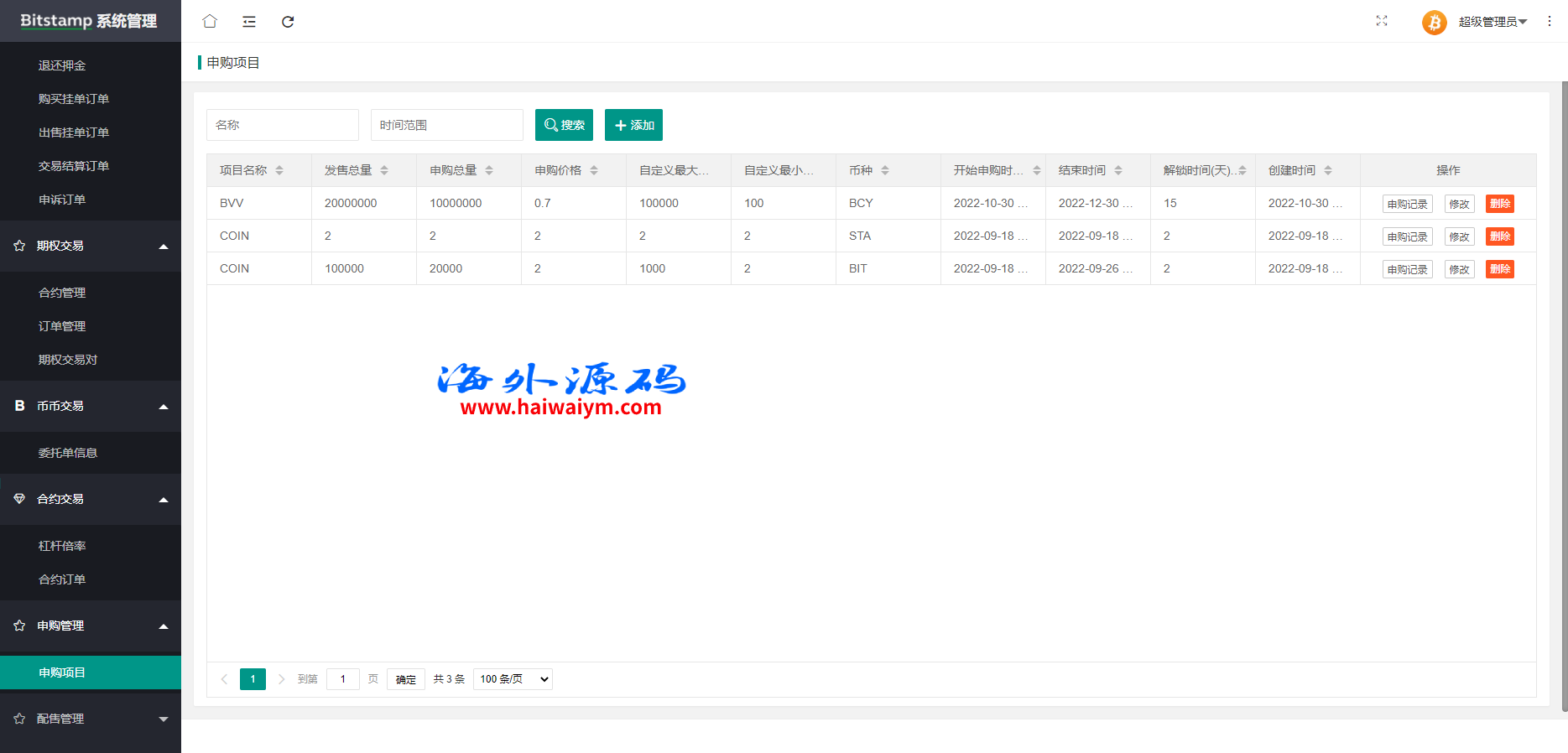 海外交易所系统/合约/期权/质押/秒合约/插针控制/申购