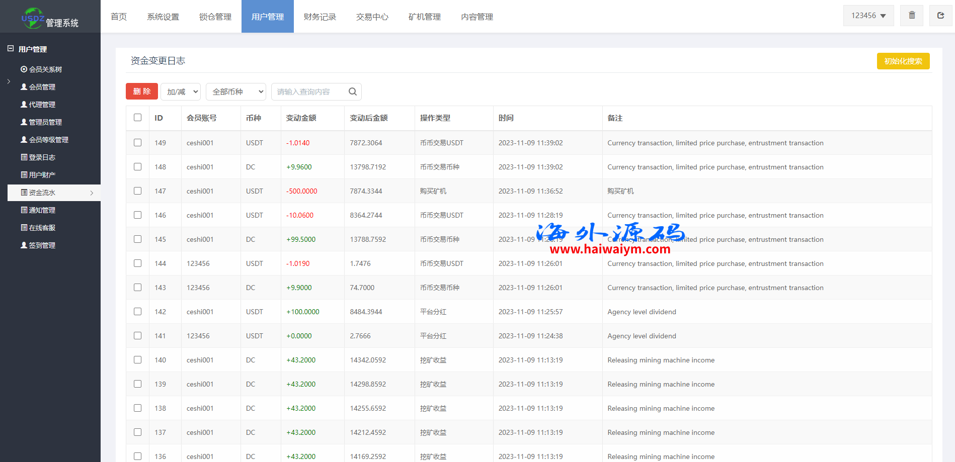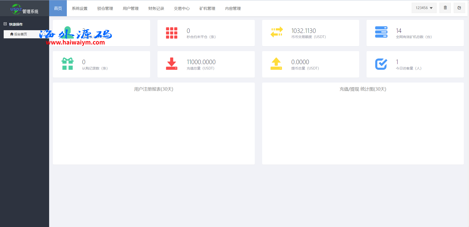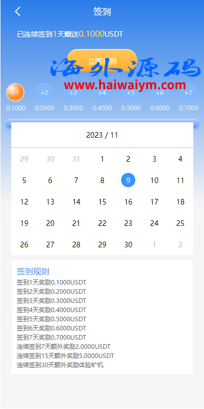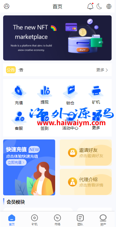 系统是定制版的矿机投资系统,功能有:购买矿机、活期锁仓、平台币市场交易、三级分销、签到、全球分红等多个功能