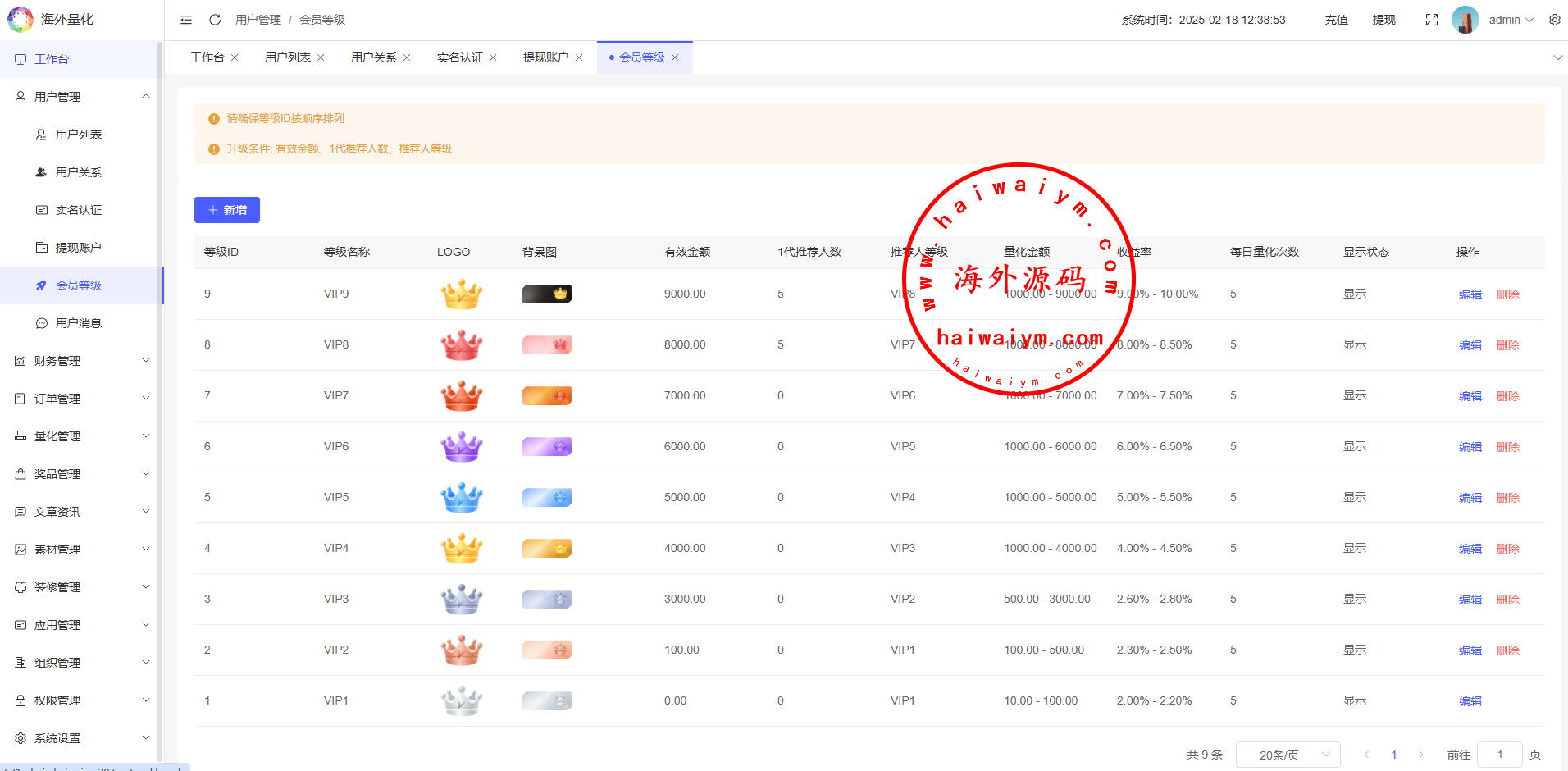 3、VIP等级划分,升级条件: 用户有效金额、1代推荐人数、推荐人等级