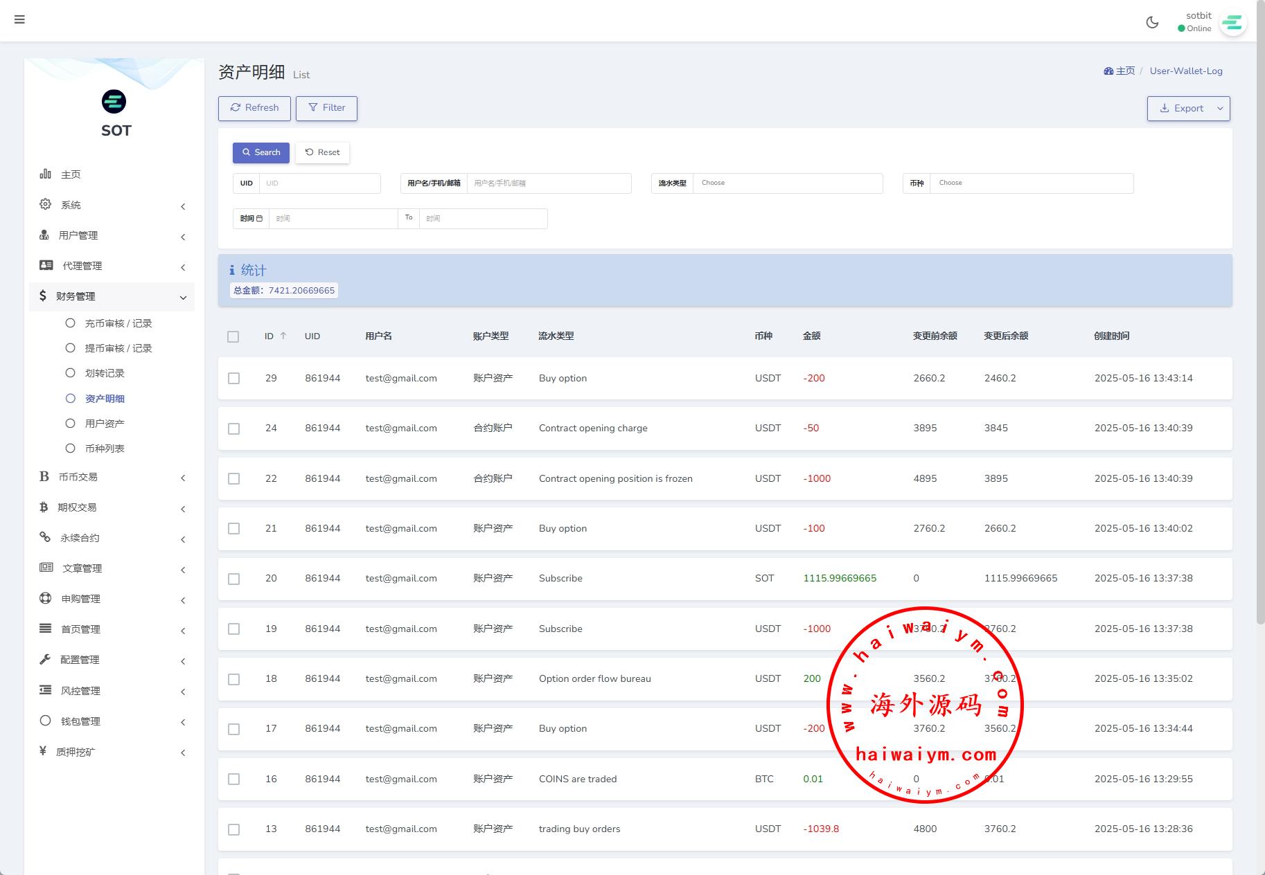 3、钱包管理(用户钱包管理、资金调节、钱包日志、转入转出记录)