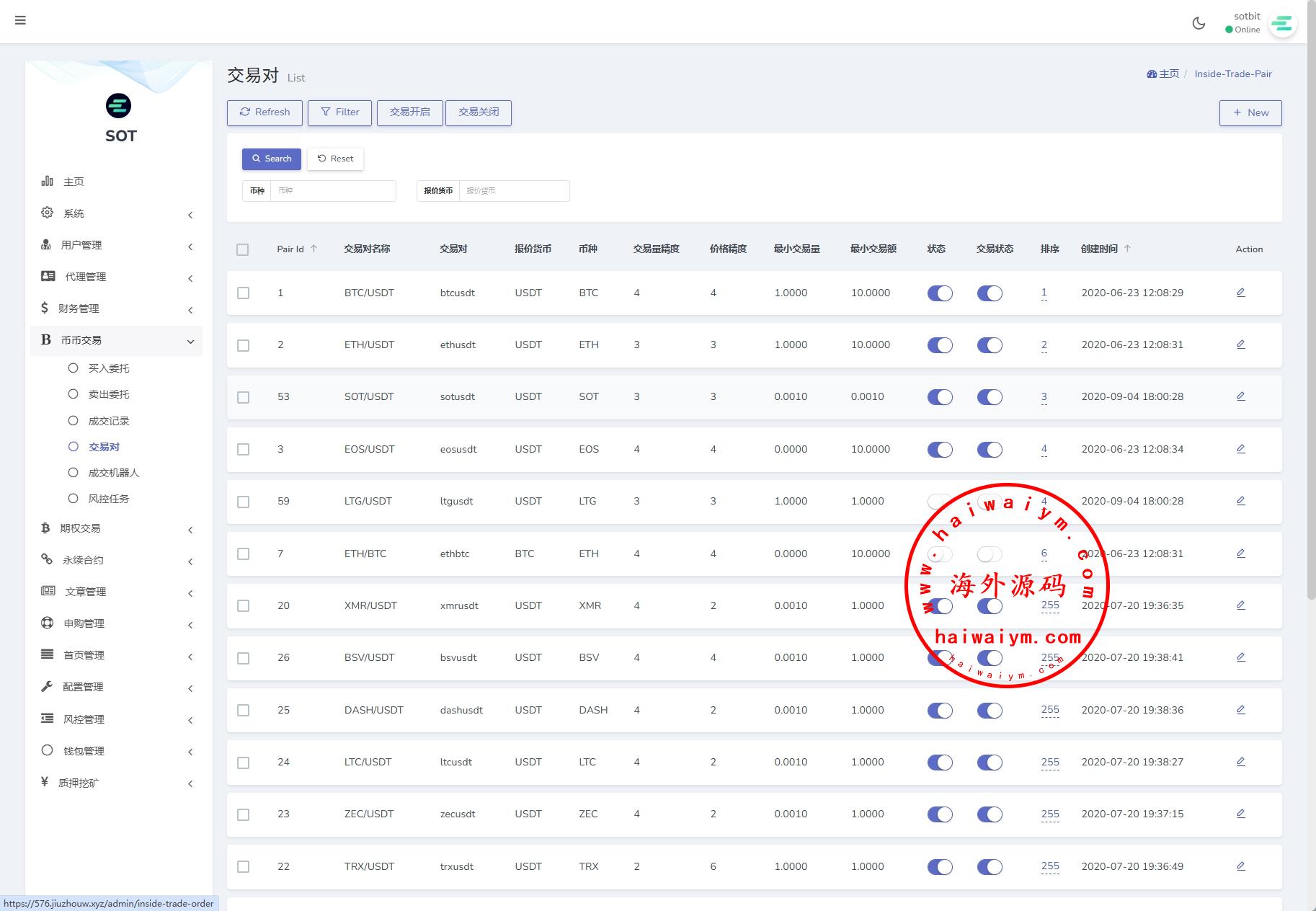 4、币种管理(币种的添加设置、提币账户管理、是否显示、交易对管理)