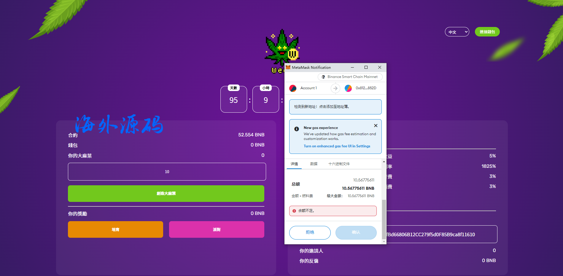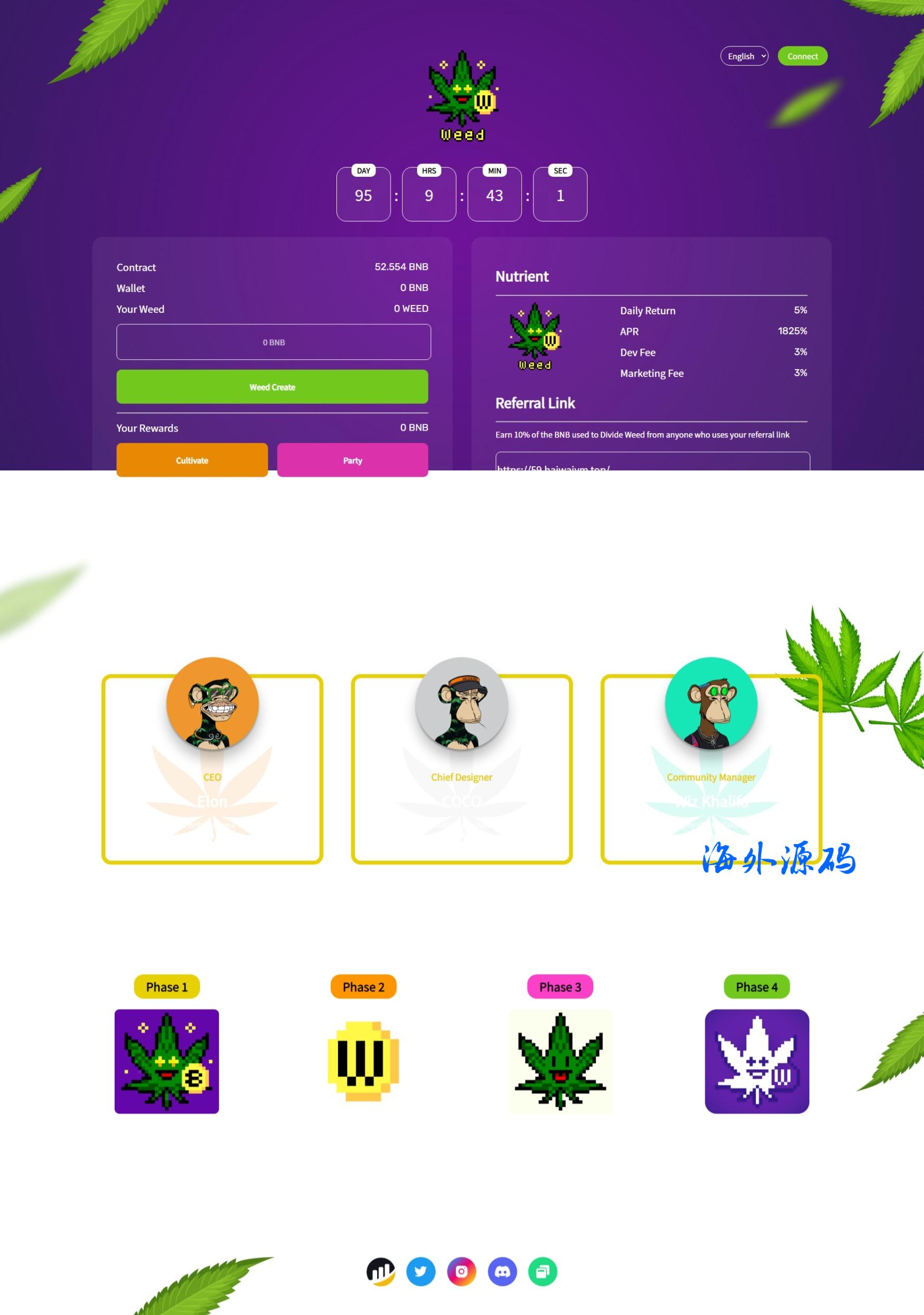 功能:由几个BAYC持有者搞出来的Defi协议资金盘日化率5%,BNB买虚拟算力挖叶子(矿)。