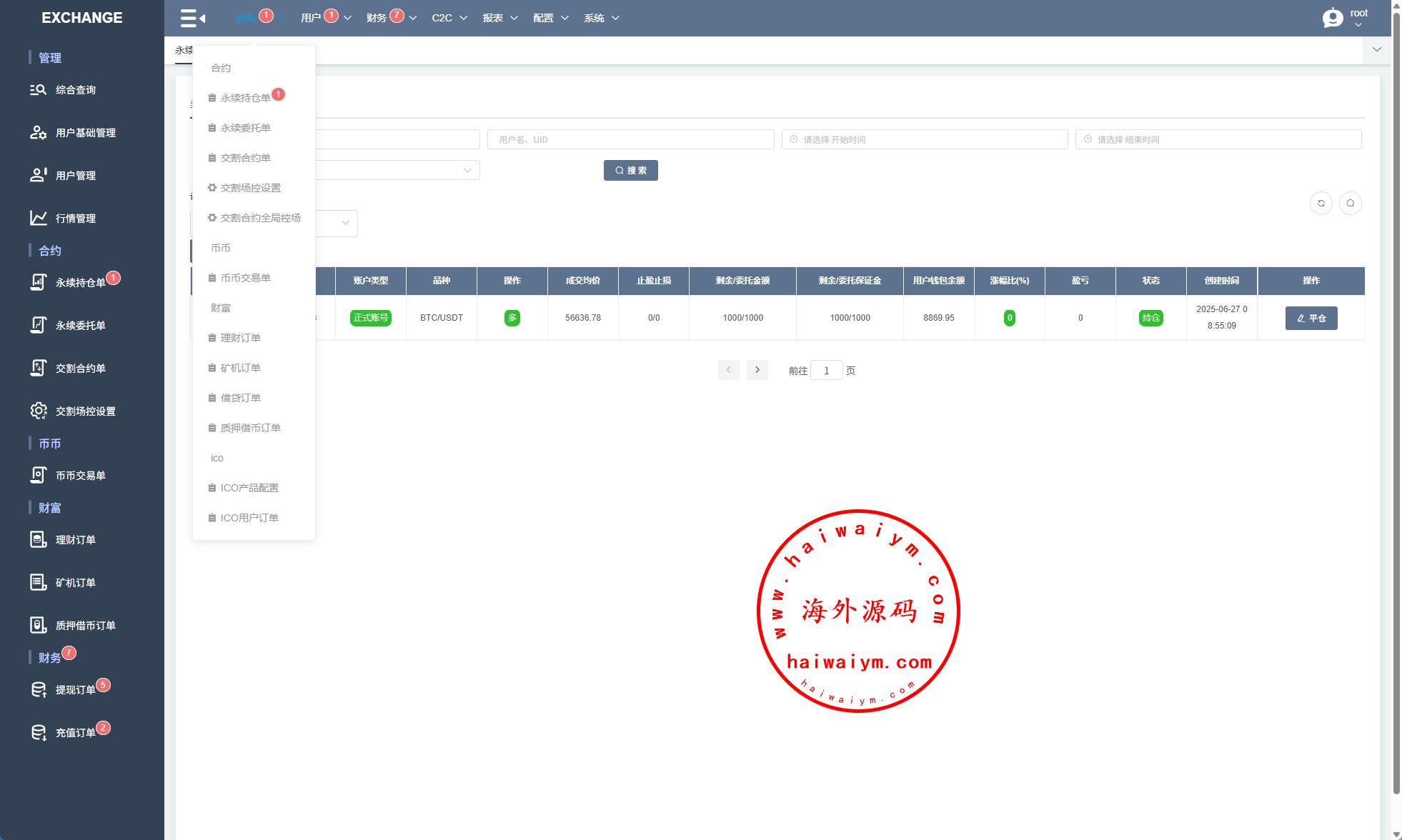 系统功能:永续合约、交割合约、现货交易、理财、矿池、质押借币等功能