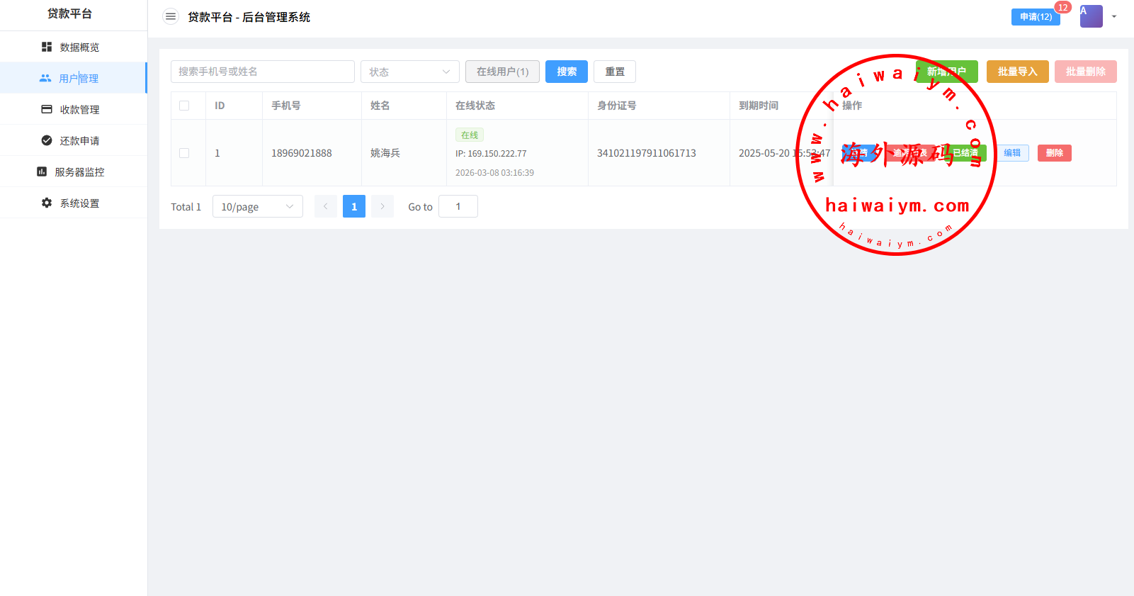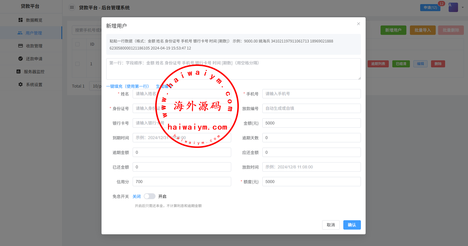 系统前端后台VUE开发,服务端JAVA开发全开源带源码后台可一键填充用户数据生成贷款逾期前端用户手机登陆,就能查看自己的欠款信息